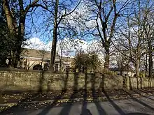 The churchyard surrounds the church on all four sides, with numerous mature trees and stone boundary walls to all sides. The boundary wall facing Church Street is Grade II listed.[8] The churchyard also contains three gravestones and a sarcophagus which are Grade II listed: