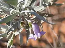 The silvery-grey foliage and lilac-coloured flowers of this compact shrub are its main attractions. It can be propagated from cuttings but most cultivated shrubs have been grown from grafting onto Myoporum rootstock. It grows best in well-drained soil in full sun but only needs an occasional watering during a long drought and is tolerant of light to moderate frosts.[8]
