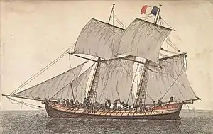 Then from 30 December to 29 April 1795, still under Menage's command, she escorted a convoy from Granville to Carteret, cruised in the vicinity of Chausey, and took up station at Regnéville-sur-Mer.[4]