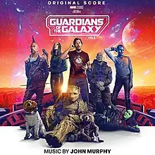 In October 2021, James Gunn confirmed that Tyler Bates, the composer of Guardians of the Galaxy (2014) and Guardians of the Galaxy Vol. 2 (2017), would not be returning to compose the film's score and that he would be replaced by John Murphy, after composing the soundtrack for the film The Suicide Squad (2021) and the television special The Guardians of the Galaxy Holiday Special (2022), both also directed by Gunn.[1][2] Despite having a different composer, some of the themes that were previously written by Bates in the previous films were referenced for the score.[2] While Gunn was filming, Murphy revealed that he already wrote some tracks for his score and ready to be played during the production of the film.[3][4]