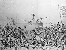 Jacob Friedrich Ludwig Lentin's Medizinische Bemerkungen auf ein literarischen Reise durch Deutschland (1800) talked about German medicine being dominated by the struggles of Brunonians and "anti-Brunonian terrorists."[14] There are also reports of 400 students rioting in a dispute between the two sides in the German university city of Göttingen in 1802.[15] One critic of John Brown's theory was August von Kotzebue, who wrote plays to reflect his disdain for this theory of medicine. In his plays he would portray Brunonianism and doctors who practiced this method in a negative light. Magazines and newspapers in Germany also reflected varying ideas on John Brown's system, some positive and some negative and critical. Röschalub's Magazin would support Brunonian medicine and promoted the system amidst criticisms from other publications at the time. Discussion on John Brown began to cease after 1809 with the end of Röschalub's Magazin. During a typhoid outbreak in 1813–1814 Brown's Brunonian medicine was briefly referenced as Germans attempted to remedy the illness.[6] By 1817, however, the German historian of medicine Kurt Sprengel suggested that Brunonian medicine "has very few supporters."[16] Once again, Brunonian medicine came back in the 1820s, and was in the spotlight again as François-Joseph-Victor Broussais rose to fame. Broussais, a French physician, was becoming very popular in the beginning of the 1820s and his medicinal theory was based on John Brown's own Brunonian medicine. Brown had also become a famous historical figure in Germany by 1846, when Bernhard Hirschel published a study on his system and the effects of Brunonian medicine. However, Brunonianism began to decline as physicians did not believe is adequately provided a scientific explanation to diseases and illnesses.[6]