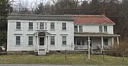 The building itself is a two-story, five-bay structure sided in pine clapboard on a drywall stone foundation. A wing of similar height projects to the south. Brick chimneys rise from either end; a large television antenna is just south of the northern chimney piercing the shingled roof.[1]