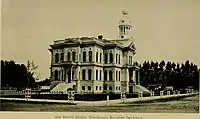 The murder trial against John T. Prewett[5] drew many visitors to the courthouse, convincing the county Board of Supervisors "that a new court house is an absolute and pressing necessity", but an election on April 12, 1887, was defeated as the bonds proposed to be issued, US$30,000 (equivalent to $980,000 in 2022), was thought to be too low. A second election on June 7, 1887, authorizing the issue of US$40,000 (equivalent to $1,300,000 in 2022) in bonds passed; four lots were purchased. The cost of the land was US$4,500 (equivalent to $147,000 in 2022) and the successful bidder for construction was Knowles & Whitmore, at US$35,987 (equivalent to $1,170,000 in 2022), working from plans drawn up by J. Gosh. The new courthouse was completed on May 7, 1888.[4]:327