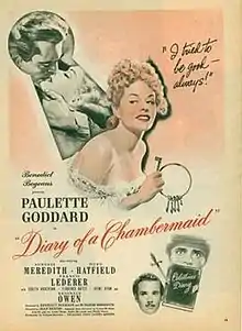 The Diary of a Chambermaid is a 1946 American drama film about a newly hired servant who severely disrupts a wealthy family. The film was based on the 1900 novel of the same name by Octave Mirbeau and the play Le journal d'une femme de Chambre, written by André de Lorde, with André Heuse and Thielly Nores. The film was directed by Jean Renoir, and starred Paulette Goddard, Burgess Meredith, Hurd Hatfield, and Francis Lederer.[1] It was named the eighth best English-language film of 1946 by the National Board of Review.[2]