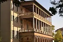 The U-shaped plan opens towards the garden. The classical-style façade includes a nine-arched portico, with a barrel vault, supported by pillars adorned with Tuscan-style semicolumns resting on square plinths. The portico is surmounted by two orders of logge with balustrades, one with Tuscan columns and the other with columns with Corinthian capitals.[1]