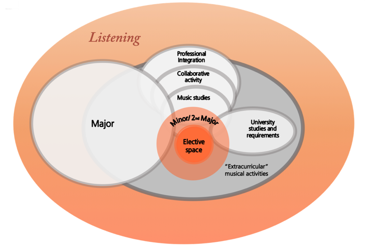 The Bachelor of Music (Honours) degree programme is a four-year, full-time programme which builds out from a focus on one of 20 music majors in instrumental performance, Composition, Voice, Audio Arts and Sciences, Music & Society and Music, Collaboration & Production. Students undertake core classes in the major, electives of their choice with a possibility for a Second Major in another area, academic music studies, collaborative music-making, professional integration, alongside University General Education requirements.
