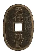天保通宝(日语:〔〕 ten pou tsu hou)是江户时代末期至明治初期在日本流通的硬币。也称为天保幣 (日语:〔〕 ten pou sen)。形状为椭圆形銅幣,中央開有一个方孔,一面寫有天保通寶,而另一面的上半部則有「當百」字樣,下半部則印有金座後藤家的花押。該硬幣的主要材料為銅,並加上铅和锡所製成的合金硬幣。一枚重量为5.5匁(约20.6克)[3]。尺寸约为高50毫米(1寸6分5厘)、宽30毫米(1寸1分) [3] 。