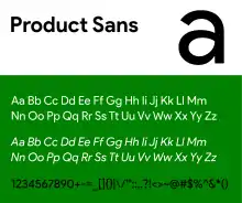 Product Sans是一款由Google建立并作商標用途的幾何无衬线体字体[2][3],並在2015年9月1日取代了Google的旧版商標字體。由於Google的標示使用範圍的擴大,其公司開始设法改造商標效果以便在有限的空間中進行绘制,並使其在不同平臺上都能保持一致。
