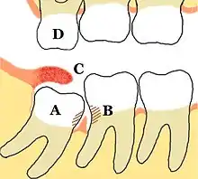 智齿(wisdom tooth)又稱智慧齒、尽根牙[1][2]、第三磨牙,是第三大臼齒(third molar)的通称,指人类口腔内牙槽骨上最里面的第三颗臼齒,从正中的门牙往里数刚好是第八颗牙齿。由于它萌出时间很晚,一般在16至25岁间萌出,此时人的生理、心理发育都接近成熟,有“智慧到来”的象征,因此被俗称或通称为“智齿”。